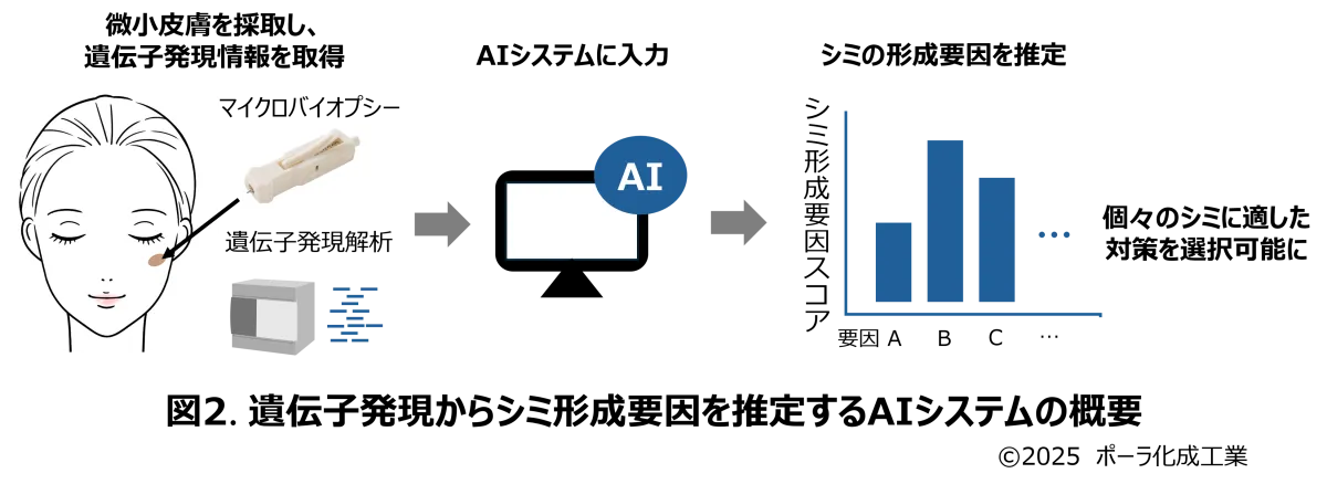 これまで、シミの対策が難しかったのは、これらの内部的要因が個々に異なるためです。しかし、新たに開発されたAIシステムは、この遺伝子情報を基にシミの形成要因をスコア化し、詳細に分析することを可能にしました。
