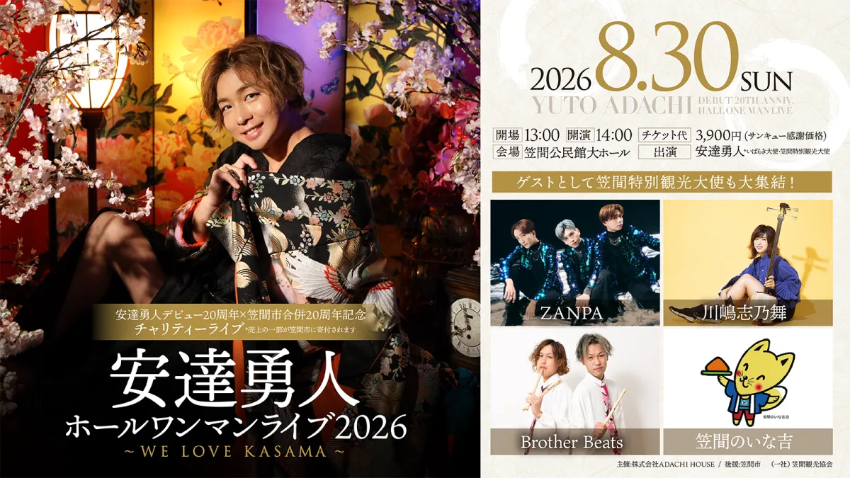 2026年8月30日(日)、茨城県の笠間公民館大ホールにて、安達勇人のデビュー20周年と笠間市の市制施行20周年を祝う記念ライブが開催されます。この特別なイベントは、地域との絆を深めるための感謝の気持ちが込められたものです。