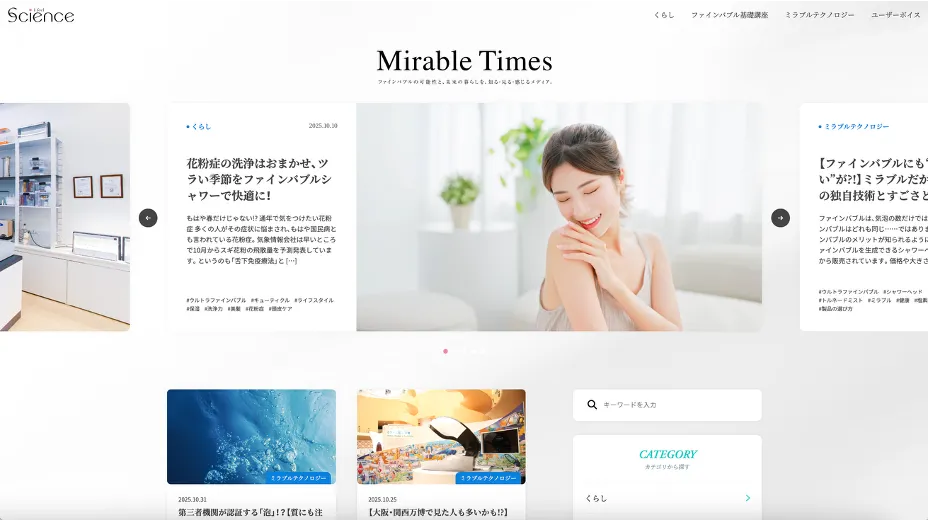 ファインバブル技術を駆使し、数々の社会課題にアプローチするインフラ企業、株式会社サイエンスが新たに立ち上げたオウンドメディア「Mirable Times(ミラブルタイムズ)」がついにリリースされました。こちらのメディアは、ファインバブルが生活や産業にどのような変化をもたらすのか、そしてその技術の背景にある開発者の熱い想いをお届けすることを目指しています。