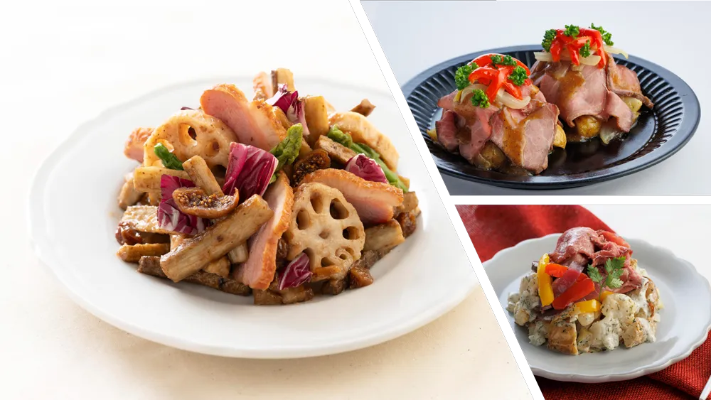 このサラダは、ジューシーなローストビーフに、グリルしたじゃがいもやパプリカなどの焼き野菜を合わせています。醤油ベースの甘辛ソースがローストビーフとの相性を引き立て、休日の特別な食事にもピッタリです。また、盛り付けにも工夫が施されていて、見た目にも楽しませてくれます。