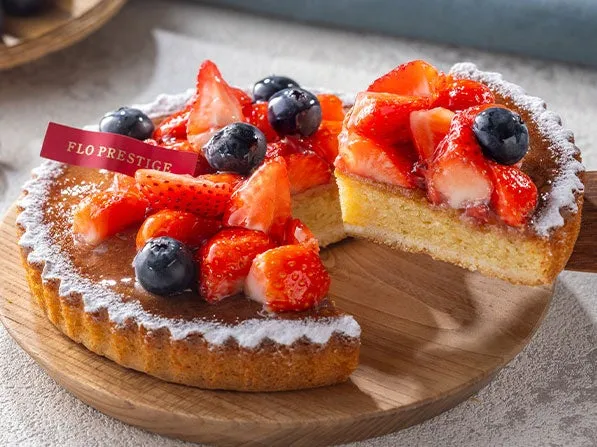 このタルトは、各店舗で焼き上げたサクサクのタルト台に新鮮な苺とブルーベリーを美しくトッピング。色鮮やかで目を引くデザインだけでなく、旬のフルーツとタルト生地の絶妙なコラボレーションが楽しめます。