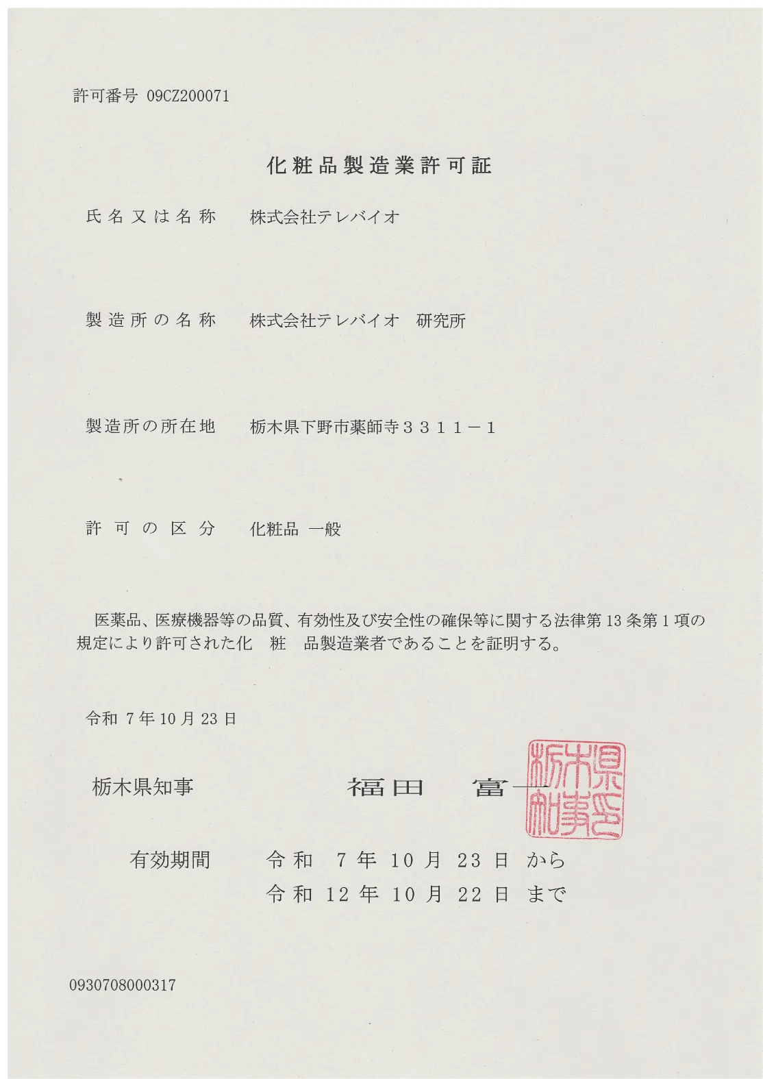 テレバイオが化粧品製造業許可を取得