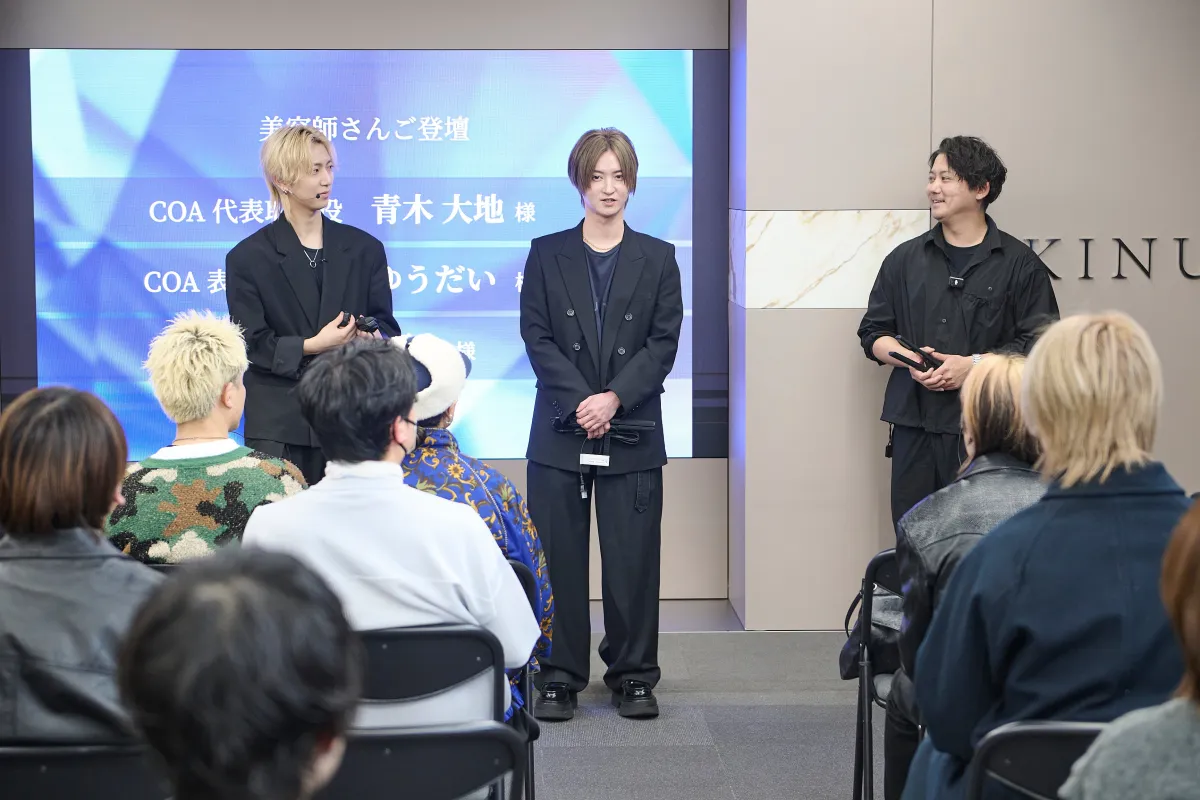 このイベントでは、株式会社COAの代表である青木大地氏、株式会社IIIの代表寺村優太氏、COA表参道店長のゆうだい氏が登壇。彼らは、縮毛矯正アイロンの開発における約2年半の道のりと製品へのこだわりを語りました。