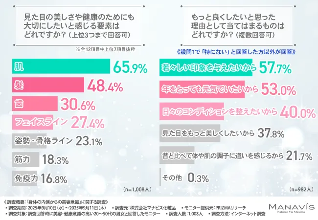 株式会社マナビス化粧品が実施した調査によれば、20〜50代の男女の多くが、外見の美しさだけでなく、身体の内側の健康状態にも関心を持っていることが明らかになりました。この背景には、コロナ禍を経て、健康や美容に対する価値観が変化したことがあります。