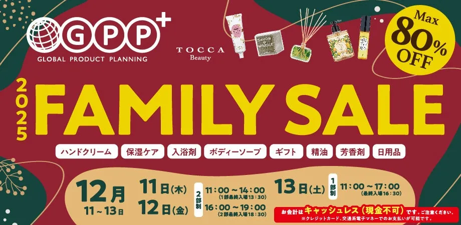 12月11日から13日の3日間、渋谷にある株式会社グローバルプロダクトプランニング(GPP)で待望の「GPPファミリーセール2025」が開催されます。このイベントでは、やさしい香りが広がるアロマ製品や、心地よいバスタイムを演出するアイテム、そして大切な人への贈り物にも最適なギフトセットなどが最大80%OFFの特別価格で販売される、年に一度の機会です。