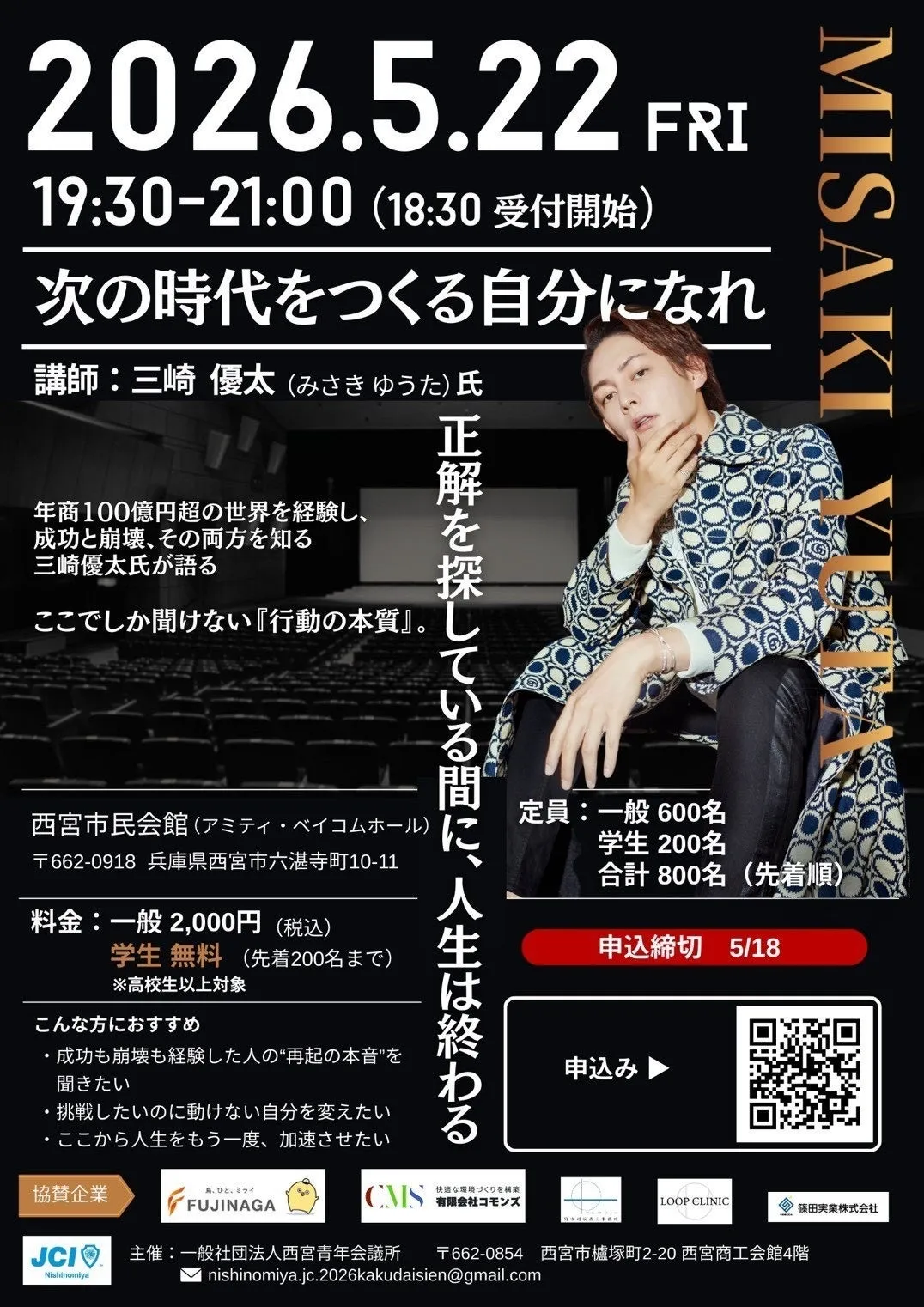西宮青年会議所が提案する「未来に向かって挑戦し続ける力」を再確認し、三崎優太氏からの直接のメッセージに触れるまたとないチャンスです。参加をご希望の方は、早めの申し込みをおすすめします。