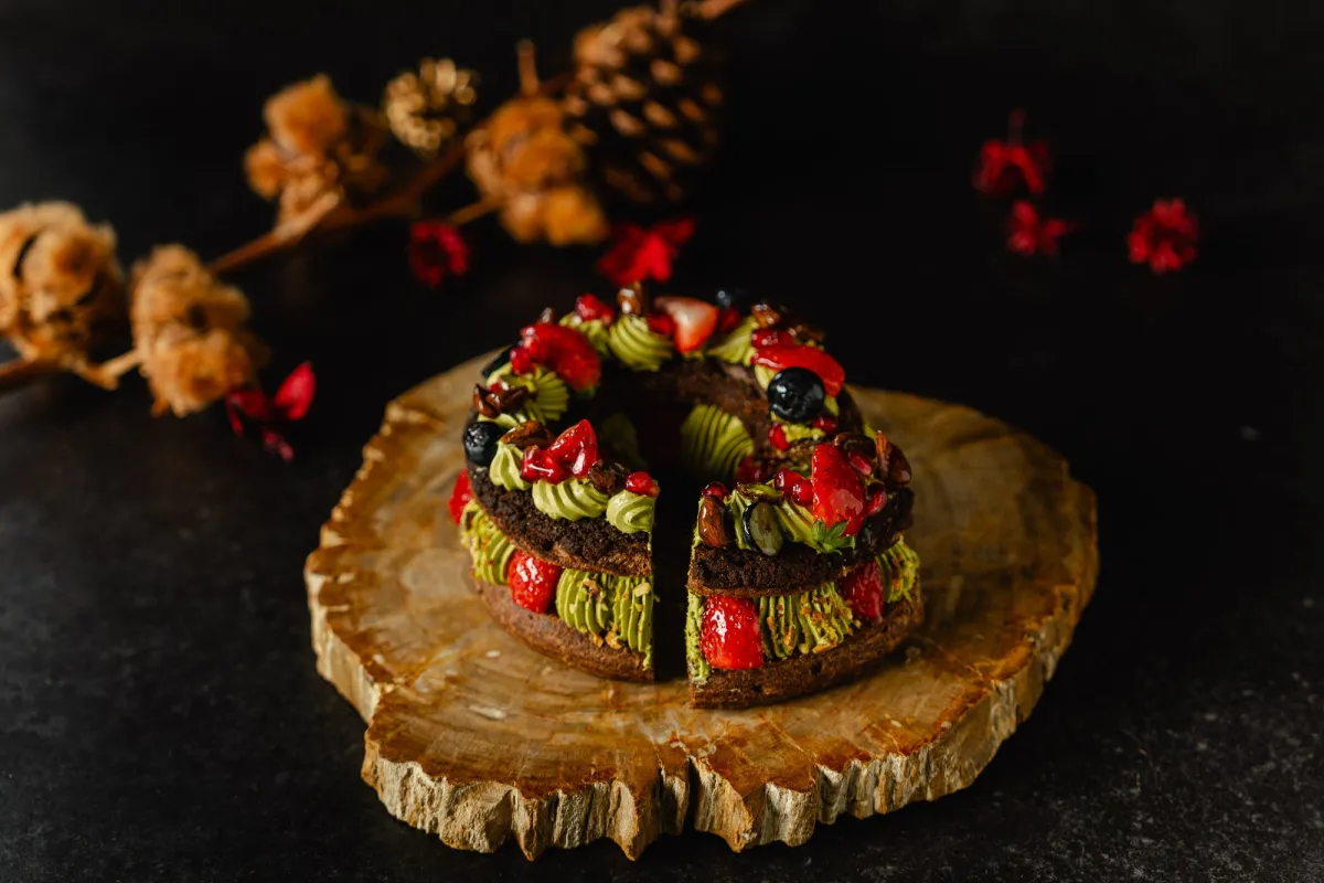 『ノエルTAKANAWAブレスト』は、華やかなクリスマスリースをイメージしたデザインが特徴です。ココアを練り込んだシュー生地に、濃厚なイタリア産ピスタチオペーストを贅沢に使用したピスタチオクリームと、軽やかなバタークリームの二層仕立てが絶妙なハーモニーを奏でます。また、酸味のあるグリオットチェリーのソースや、栃木県産の新鮮ないちごがトッピングされ、見た目にも味わいにも豪華さが際立っています。