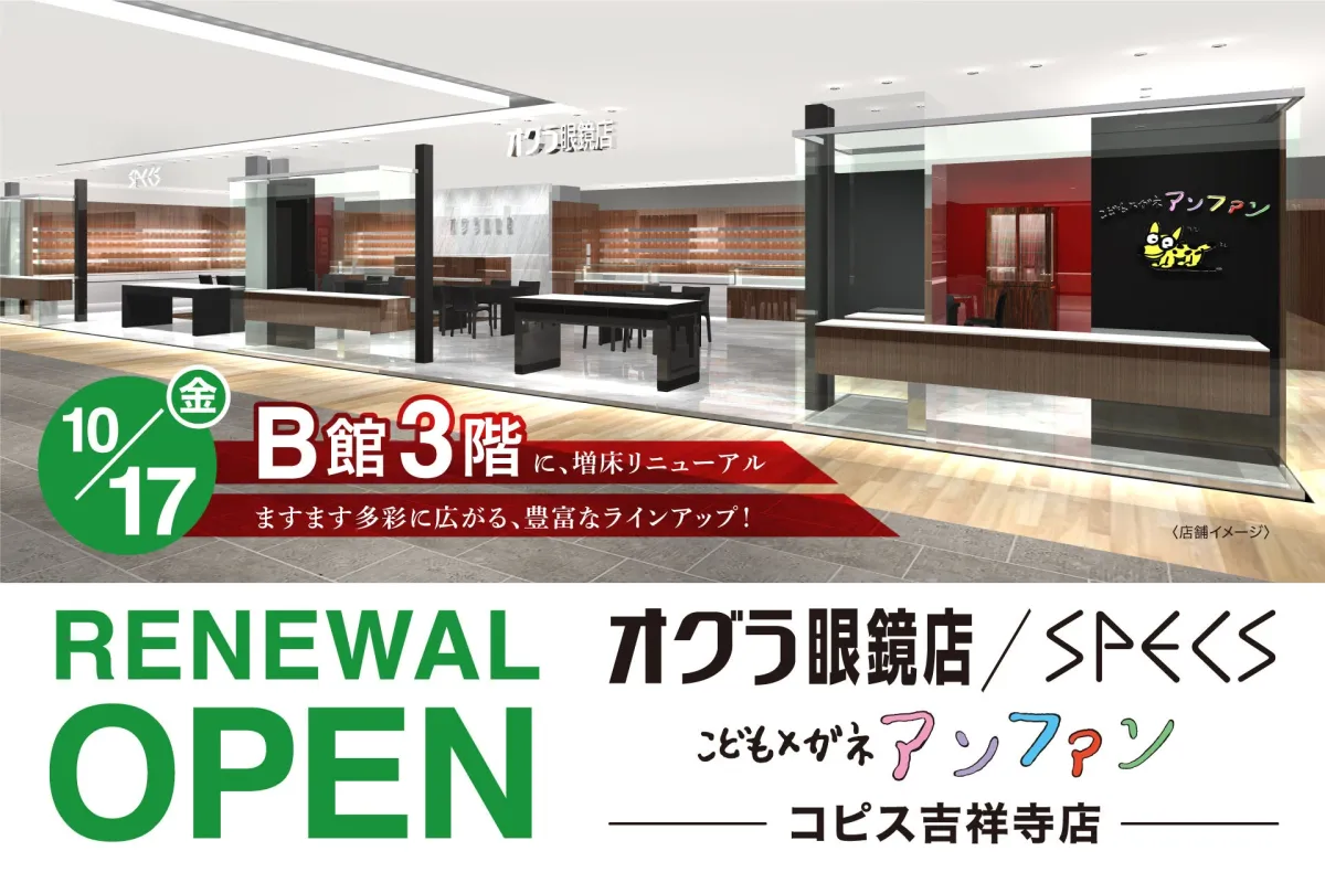 2025年10月17日金曜日、オグラ眼鏡店がコピス吉祥寺にて大規模な増床リニューアルオープンを果たします。この新たな店舗では、オグラ眼鏡店が展開している「SPECS」や「こどもメガネ アンファン」という人気ブランドを取り入れ、幅広い世代に向けたアイウェアがそろっています。