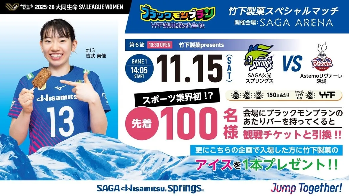 バレーボールシーズンがいよいよ本格化してきました。そして、今回は特別なイベント情報をお届けします!2025年11月15日(土)、SAGAアリーナにて行われる「竹下製菓スペシャルマッチデー」に参加すると、嬉しい特典があり、ブラックモンブランが楽しめるキャンペーンが実施されます。