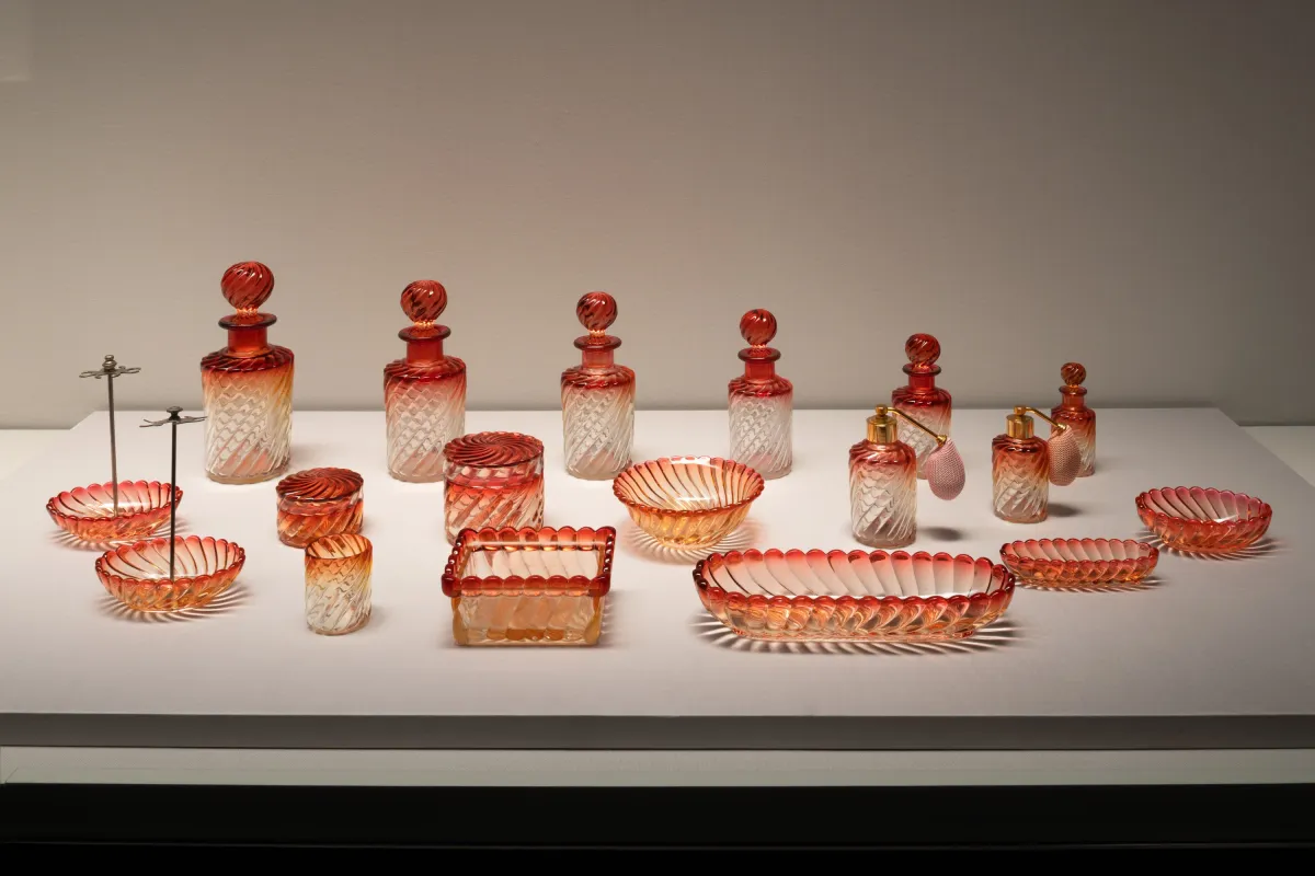 展覧会では、美しい化粧セットがこだわりをもって展示されており、特に各時代を象徴するアイテムに注目が集まります。1940年代に制作された《ローズ色ガラス化粧セット》や、19世紀末から20世紀初頭に流行したアール・ヌーヴォー様式の華やかな化粧道具、また、アール・デコ様式のコンパクトや携帯型の化粧セットも展示されており、それぞれの時代の美意識を浮き彫りにしています。また、パウダーボックスやマニキュアセット、香水瓶、鏡、ブラシなど、装飾性と実用性を兼ね備えたアイテムが全体的に集められているため、訪れる人々は化粧文化の豊かさに触れることができます。