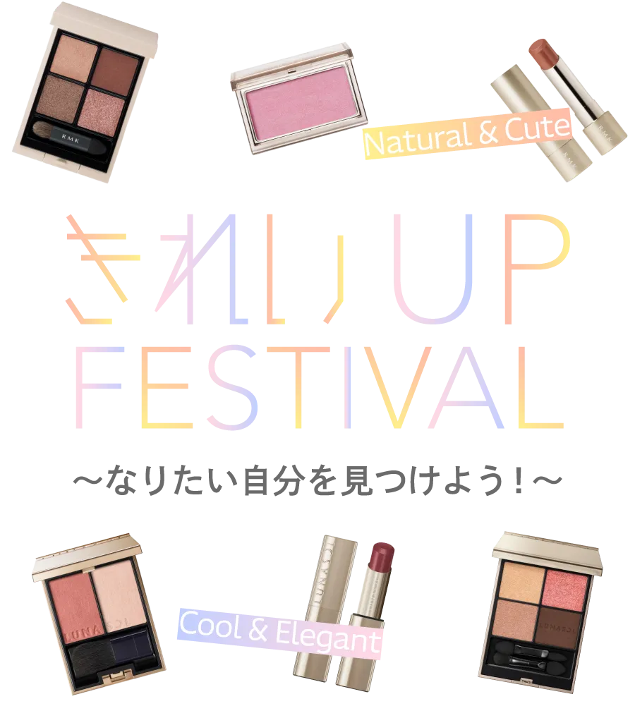「きれいUP FESTIVAL」では、あなたの理想のスタイルを叶えるためのメイクアイデアをたっぷりご提案。やわらかくかわいらしいナチュラル&キュートな雰囲気から、大人っぽく洗練されたクール&エレガントなスタイルまで、その日の気分に合わせて選ぶことができます。