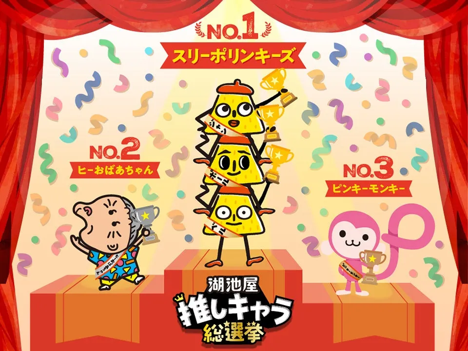 この企画は湖池屋の人気キャラクター9名の中からファンの好みによってNo.1を決めるもので、スリーポリンキーズはファンの期待に応え、堂々のトップに立ちました。2位はヒーおばあちゃん(カラムーチョ)、3位にはピンキーモンキー(Pinky)が選ばれました。