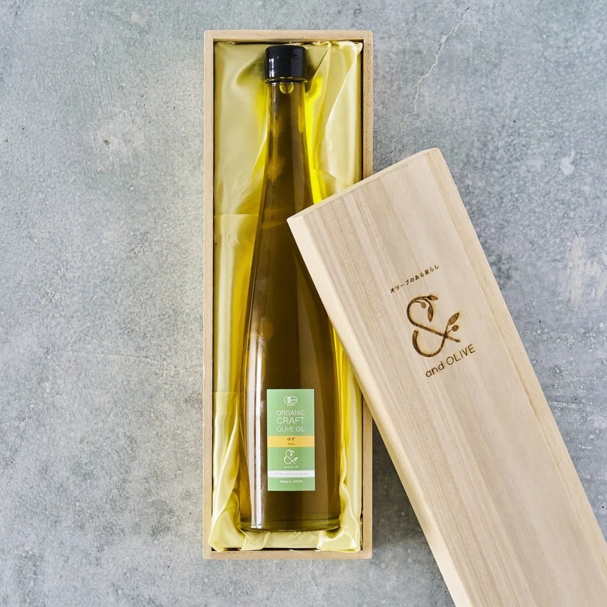 「ロンドン受賞記念YUZU OLIVE OIL」は、500ml入りで税込み10,800円。美しいボトルに封入され、シリアルナンバー付きの桐箱でのご提供となります。この桐箱が解放される瞬間、まるで特別な宝物を手に入れるかのようなワクワク感を感じることでしょう。