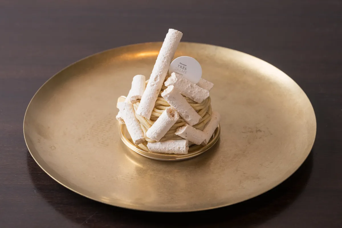 この逸品は、香ばしいヘーゼルナッツが加わった軽やかなメレンゲの上に、ノチェロの香りが優雅に広がる生クリーム、濃厚な栗ペーストが重ねられた一品です。トップには、和風の香りを持つきな粉が振りかけられており、ひと口食べると和の風味が口いっぱいに広がります。栗の贅沢な甘さとメレンゲの軽やかな食感が見事に調和しています。