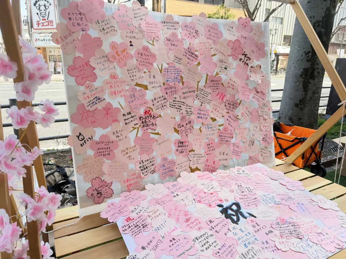 会場には、巨大な卒業証書を背にしたフォトスポットが設けられ、来場者は友人や家族と共に記念撮影を楽しむことができました。また、「桜メッセージボード」や「1年後の自分へ手紙を書く」企画も実施され、世代を超えた交流の場となりました。これにより、参加者は他の卒業生と未来について考える機会を得、心温まるメッセージを寄せ合う姿が見られました。