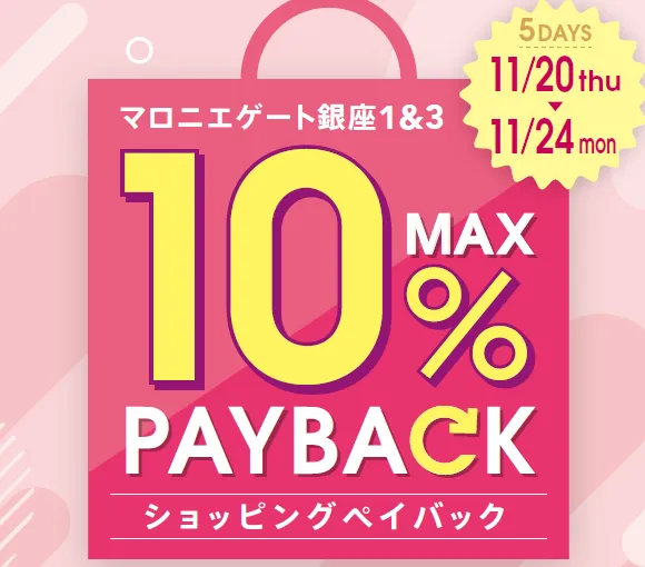 2025年11月20日(木)から11月24日(月・休)までの期間、東京・銀座の「マロニエゲート銀座1」にて特別なショッピングイベントを開催します。最大10%が還元される「ショッピングペイバック祭」が実施され、対象店舗でのお買い物が俄然お得に!
