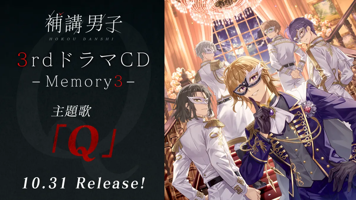 2025年10月31日(金)、株式会社アース・スター エンターテイメントより、話題の『補講男子』3rdドラマCD『~Memory 3~』の主題歌となる「Q」がリリースされます。この楽曲を歌うのは、人気声優によるユニット・WITHPER(ウィスパー)。メンバーは藤代晴仁(小林裕介)、柏谷信(豊島聖人)、堂満智(堂島颯人)、貴志礼世(岡本信彦)、茶屋町義也(今井文也)と、豪華な顔ぶれが揃っています。