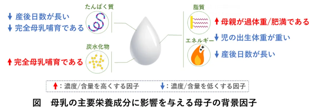 結果として、成熟母乳の主要栄養成分やエネルギー含量が、完全母乳育児の実施、母親の体格(過体重または肥満)、児の出生体重、産後日数等に関連していることが示されました。つまり、母乳成分は母親の特徴や育児の状況を反映し、健康な育児において考慮すべき重要な要素であることが明らかになったのです。