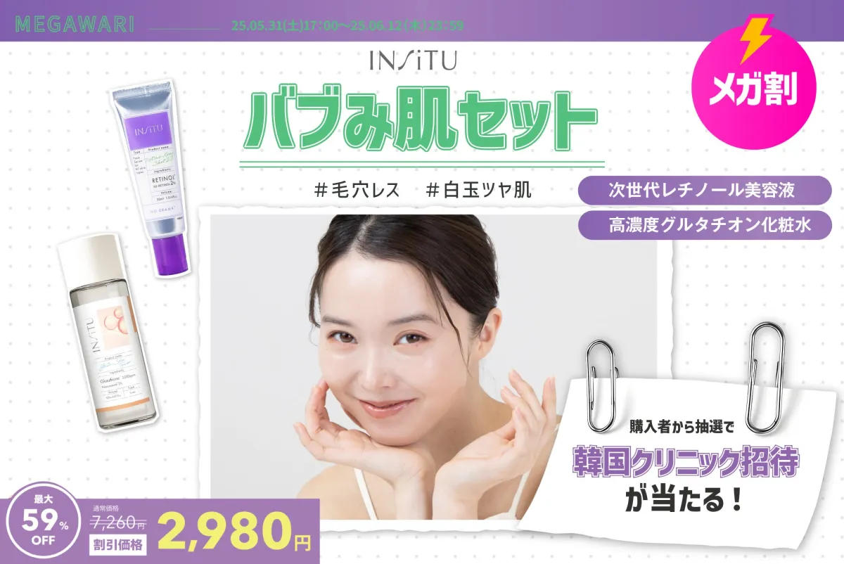 2025年5月31日からのQoo10メガ割で、スキンケアブランドINSiTU(インシトゥ)が提供する「バブみ肌セット」が特別価格で登場します。このセットは、肌のトラブルをしっかりケアしつつ、実質59%オフの2,980円(税込)で手に入ります。毎日のスキンケアに取り入れて、肌トラブルを炎上させることなく艶やかな美肌を手に入れましょう。