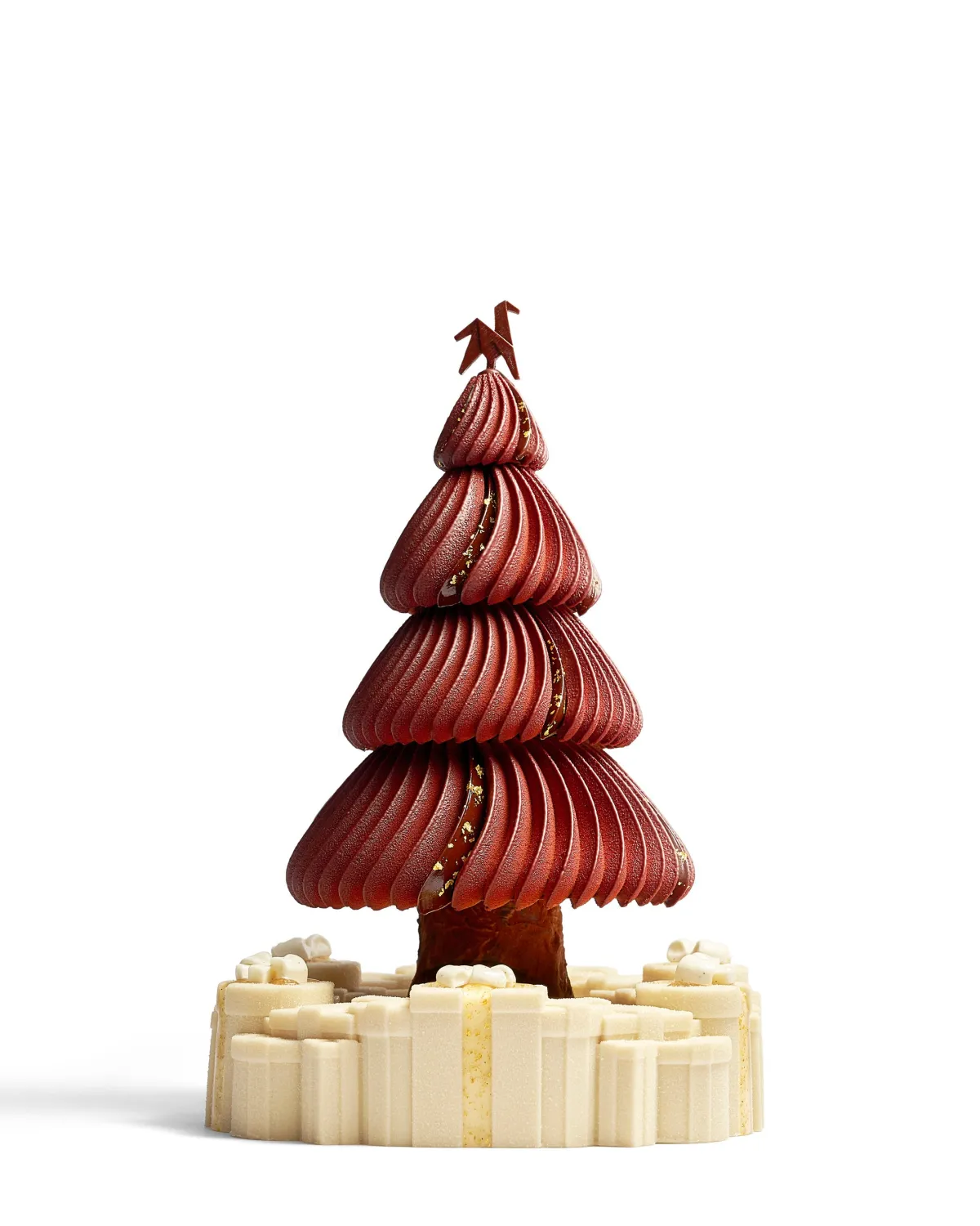 このデセールの中心には、巧みにデザインされたチョコレート製のクリスマスツリーがあります。ツリーは75%ダークチョコレートから成り、まるで交響曲の楽章のように、流れるようなデザインで仕上げられています。さらに、ユーザーはこのツリーの中にたくさんの秘密を隠されていることを知るでしょう。一部の層には、特製のスペキュロス入りプラリネや、ピスタチオ、ヘーゼルナッツ、アーモンド、オレンジピールを散りばめた魅惑のマンディアンが潜んでおり、ひと口ごとに多様な味わいを楽しませてくれます。