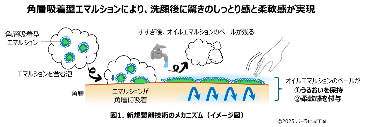 多くの洗顔料は、肌の皮脂や汚れと一緒に生体保湿成分も洗い流してしまい、洗顔後に乾燥を感じやすいという課題があります。そこでポーラ化成工業は、洗顔後にも肌に残る角層吸着型のエマルションを開発しました。これにより、洗顔しながらも肌の水分をしっかりと保つことが出来ます。