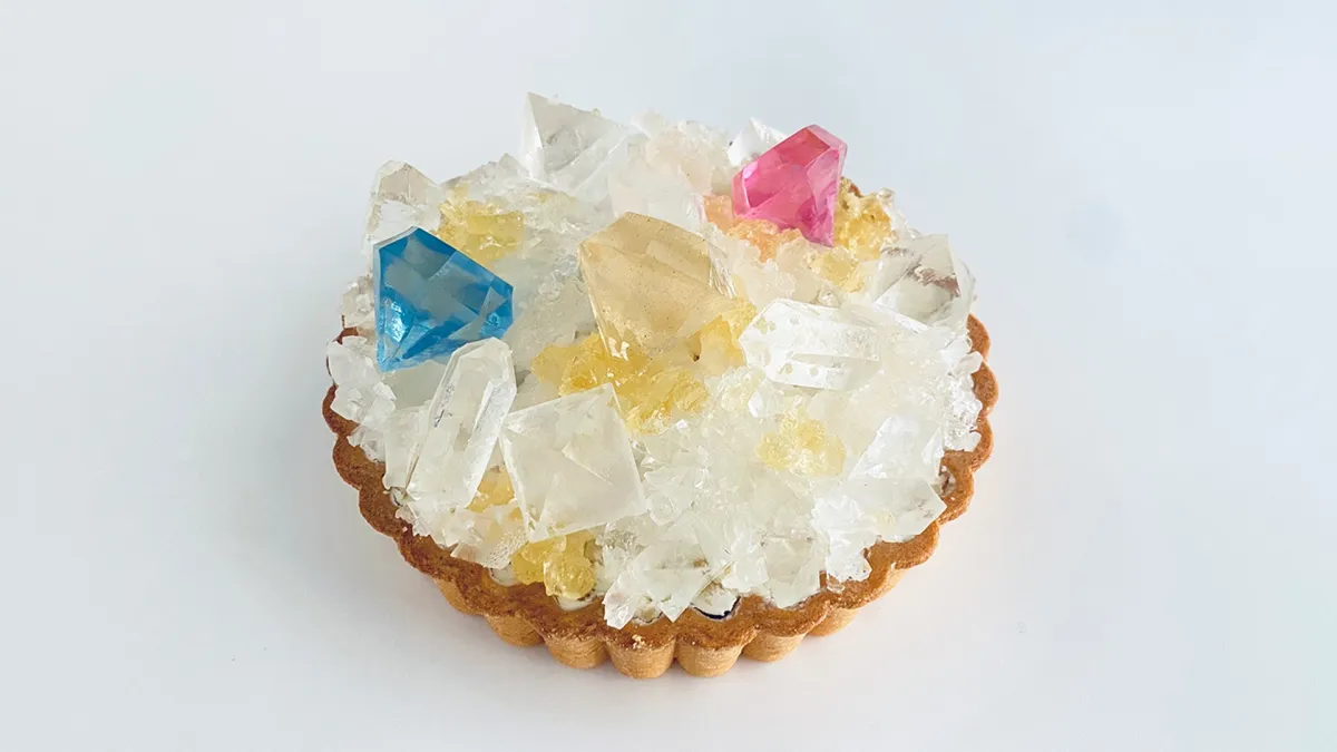 この特別なアイスタルトは、毎月限定で販売されている「誕生石タルト」の4月バージョン。ダイヤモンドの透明感あふれる輝きが、手切りの琥珀糖を用いて繊細に再現されています。イエロー、ピンク、ブルーといった様々な色合いのダイヤモンドをイメージしたこうぶつヲカシが贅沢にあしらわれていて、目にも美しい逸品です。職人が心を込めて切り出す手作りの琥珀糖は、唯一無二の魅力を放っています。