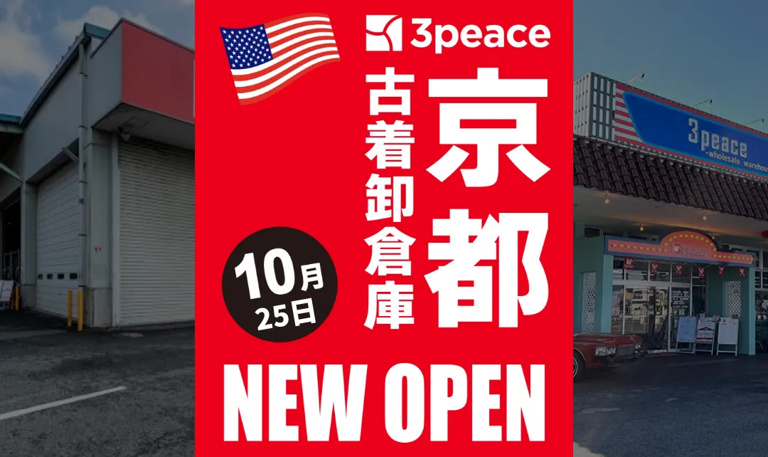 若い世代を中心に熱烈な支持を受けている古着ブランド「3peace」が、京都府宇治市に新たな古着卸売倉庫をオープンすることが決定しました。10月25日(土)にグランドオープンを迎えるこの店舗は、全国に展開する3peaceの倉庫としては6店舗目となります。京都ならではの古着文化の加速とも言えそうです。