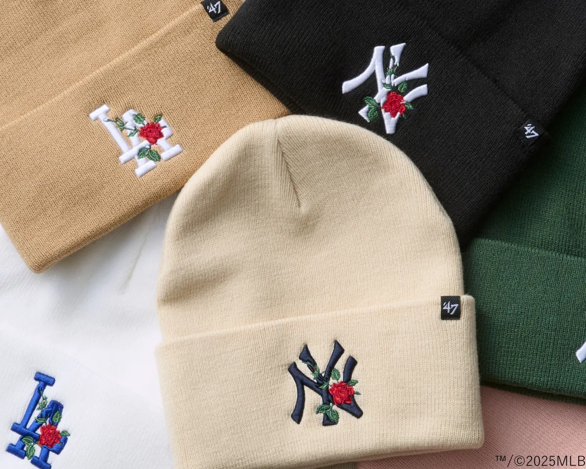 新作のニットキャップは、ニューヨーク・ヤンキースとロサンゼルス・ドジャースのMLB球団ロゴと、バラの花を結びつけたユニークなデザインが特徴です。プレッシャーをかけることなく快適さをもたらす伸縮性のあるリブ編みと、存在感のある太めのカフが相まって、ただのニットキャップから一歩進んだおしゃれなアイテムに仕上がっています。特に、柔らかいベージュやピンクといった優しいトーンだけでなく、定番のブラックもラインナップ。どんなコーディネートにも合わせやすく、冬のスタイルにフェミニンなアクセントを加えることができます。