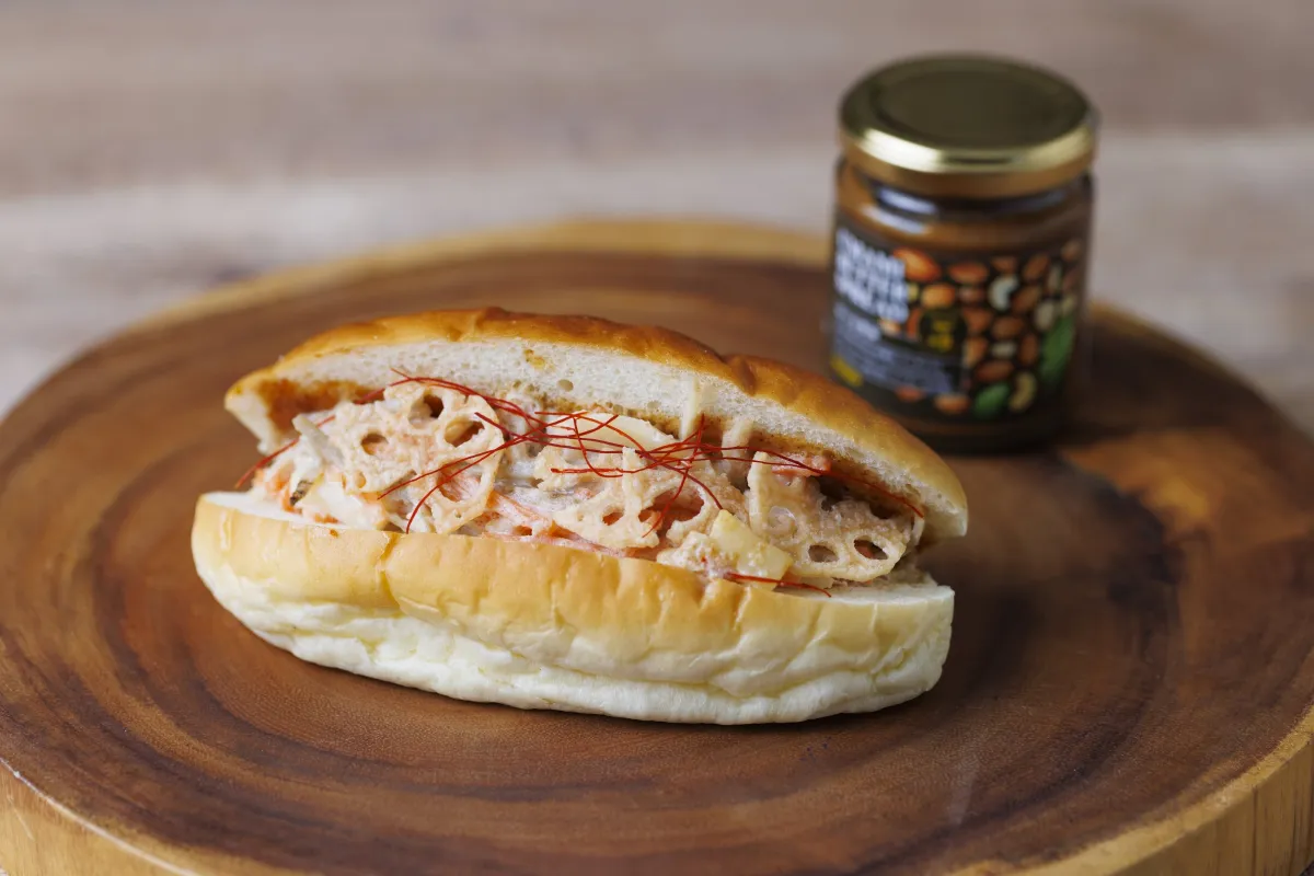 「UMAMI酒種コッペパン」は、酒種を生かしたふんわりとしたコッペパンに、雅結寿の特製「UMAMI BUTTER SPREADーかつお醤油ー」を塗り、さらにたらこマヨネーズで和えたきんぴらごぼうをサンドしています。さらに香ばしいれんこんチップスまで添えられ、見た目にも食べ応えにもこだわった作品となっています。
