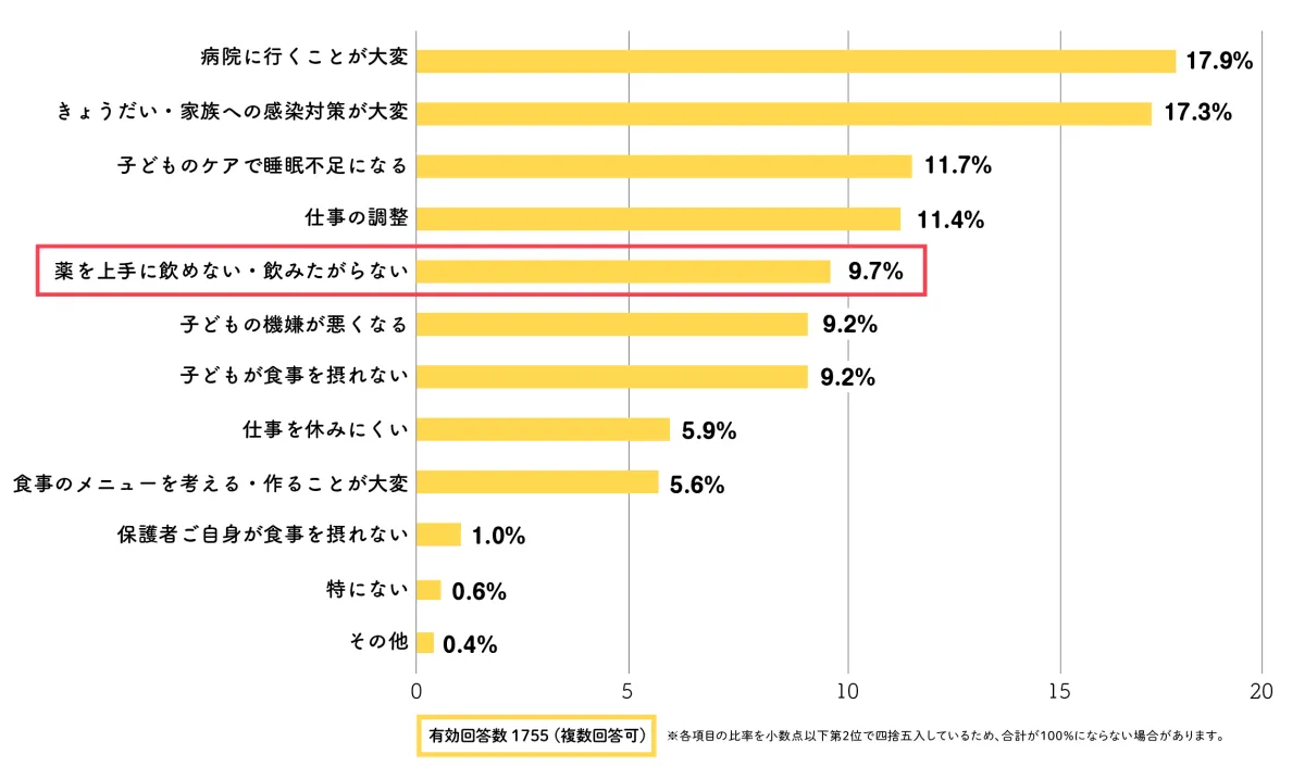 調査によると、病気の時に特に問題になるのは「病院に連れて行くこと」です。家事や仕事と両立しながら病院へ行くのは、多くの保護者にとって負担になっています。その中で5位にランクインしたのが、「薬を上手に飲めない・飲みたがらない」という悩みです。子供が薬の重要性を理解するのは、なかなか難しいものです。