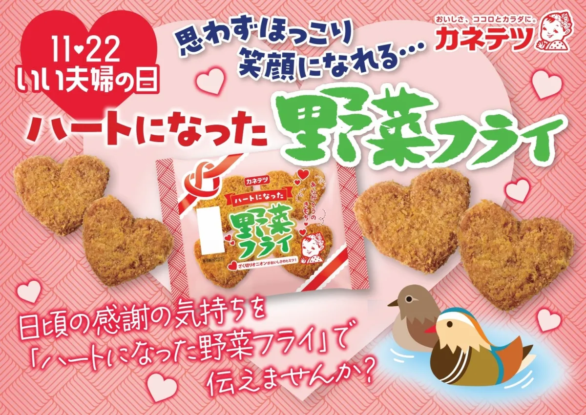 「ハートになった野菜フライ」は、1955年の発売以来、長年にわたり多くの人に愛され続けてきたロングセラー商品「野菜フライ」のアレンジです。通常のサイズから一新し、可愛いハート型に仕上げられたこの商品は、4個入りの特別仕様。味わいや食感はそのままに、感謝の気持ちを形にしています。