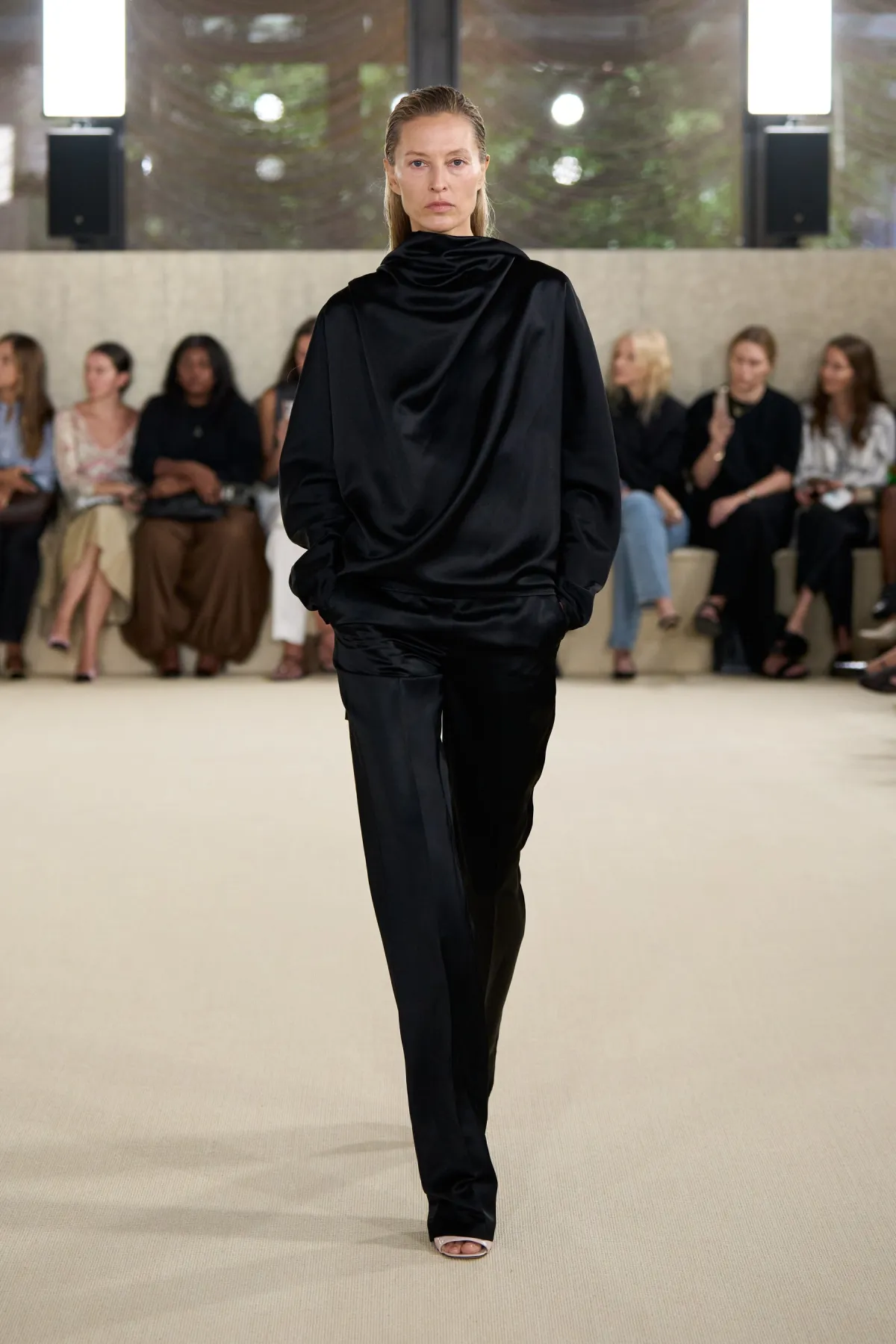 コレクションの中心アイテムは、気負わない自然体のムードが漂います。流れるようなスカートやパンツに重ねることで、ニットタンクトップやしなやかなスリップドレスが生み出すリラックス感と精緻さのバランスが絶妙です。また、シャープな襟のコートやスリムなボディスーツとのレイヤリングは、柔らかさの中に緊張感を添えています。特に、切りっぱなしのトリムを施したモノクロームのサテンセットアップは、昼から夜への移行を自然に演出します。