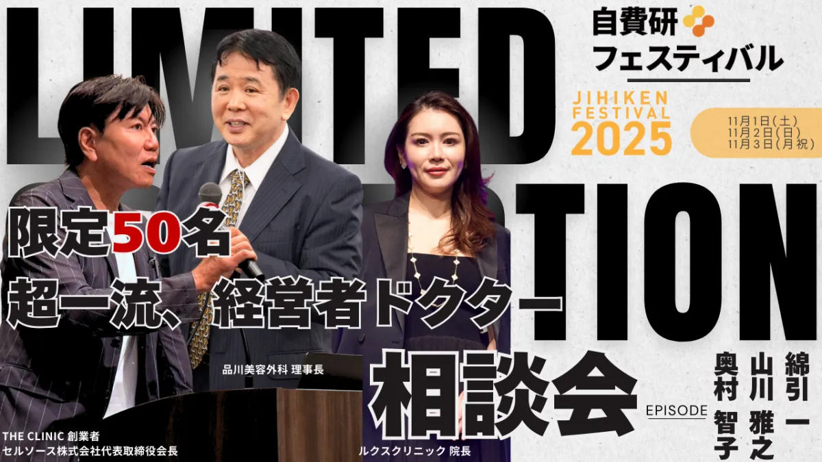 美容医療や自費診療の最前線で活躍する経営者ドクターたちが集まる自費研フェスティバル2025が、2025年11月1日から3日まで東京のTOCビルで開催されます。この特別なイベントには、自費研フェスティバルの参加者限定で、経営に関する悩みやキャリア形成の相談ができる「超一流経営者ドクターが直接応える!自費診療相談会」を予定しています。参加者は、経営者や医師たちのリアルなアドバイスをダイレクトに受け取ることができるユニークな機会になることでしょう。