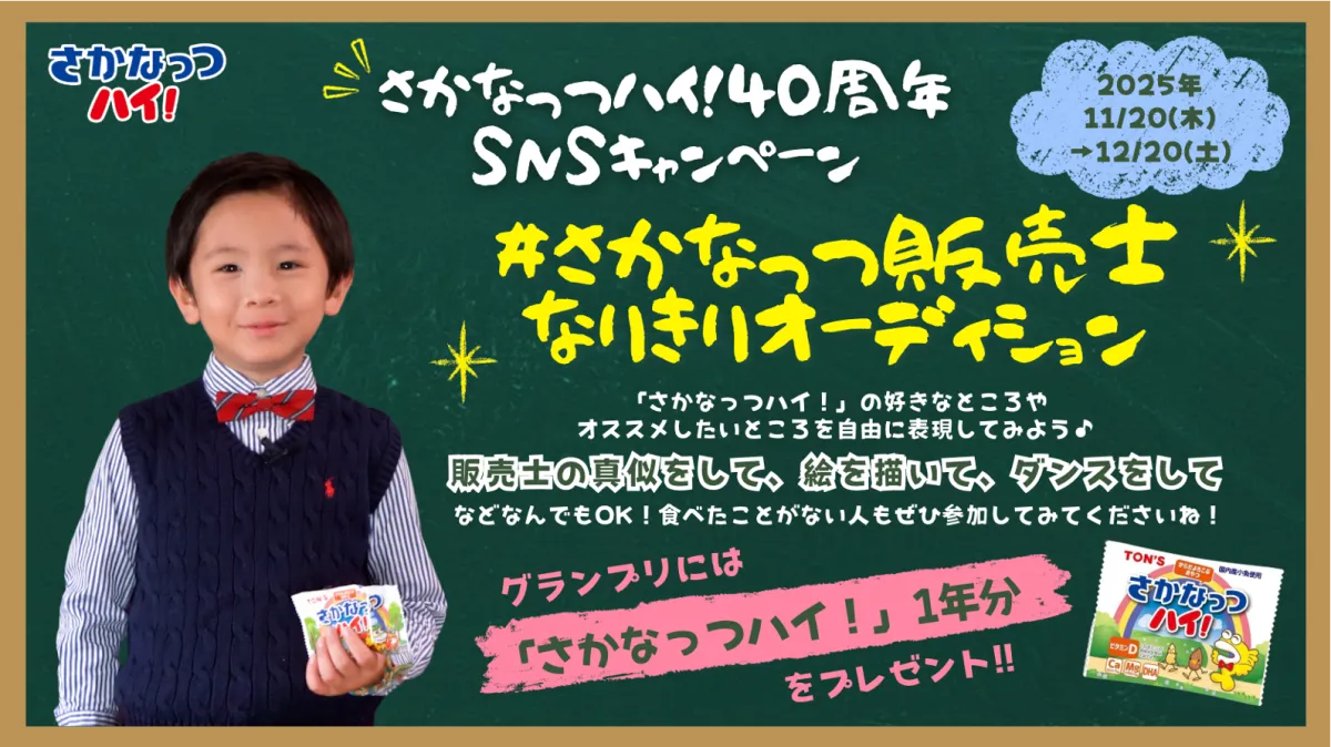 東洋ナッツ食品株式会社が40周年を迎え、人気商品『さかなっつハイ!』の新たな企画「#さかなっつ販売士なりきりオーディション」をスタートします。このオーディションは、2025年11月20日から始まり、子どもたちが自身の魅力を映し出す絶好の機会です。最優秀賞に選ばれた応募者にはなんと、『さかなっつハイ!』が1年分プレゼントされる豪華な特典も!