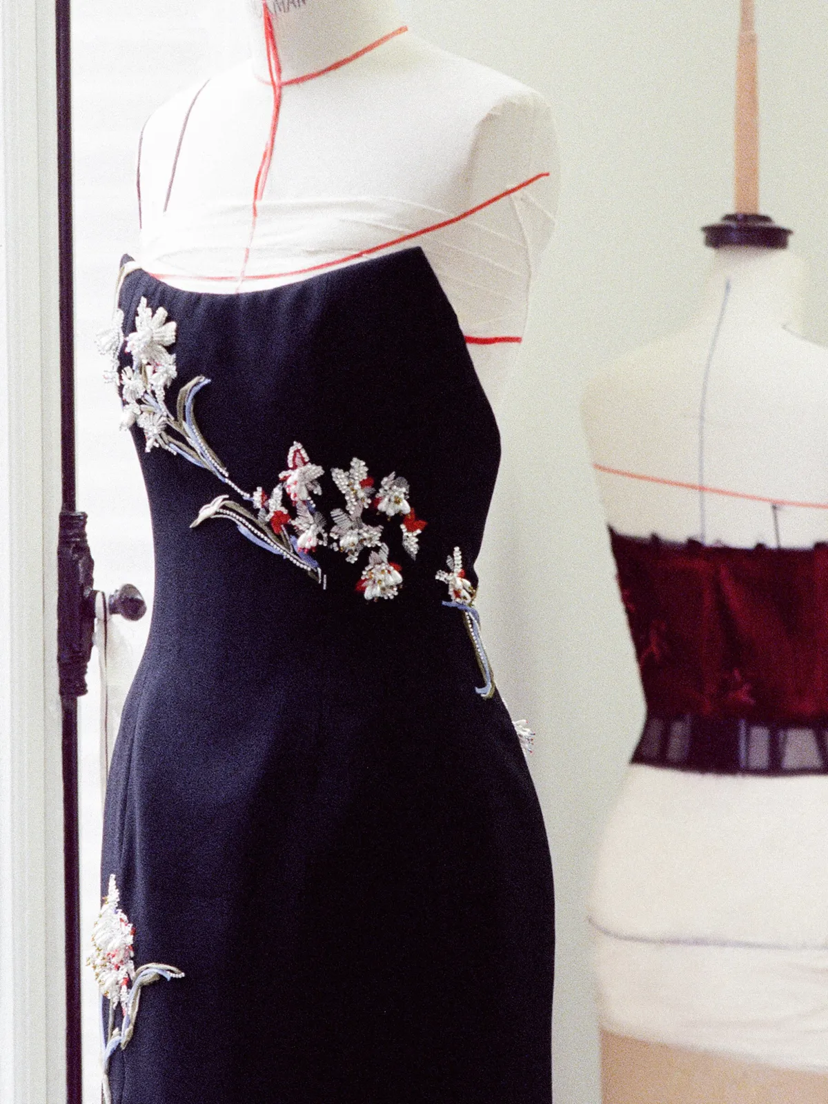 ローズ・バーンが選んだこのドレスは、ブラッククレープで仕立てられたストラップレスのデザイン。全体に施された花柄の刺繍は非常に繊細で、見る者の目を惹きつけます。また、ドレープ感が巧みにデザインされており、動くたびに流れるような美しさを演出しています。優雅かつ洗練された印象を与えるこのドレスは、特にアカデミー賞という華やかな舞台にふさわしい装いと言えるでしょう。