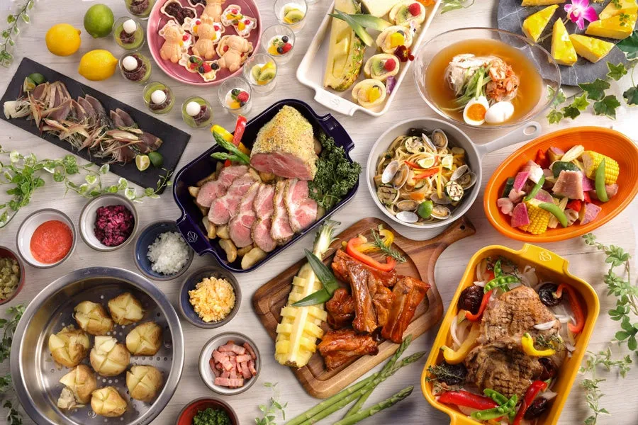 さらに、自慢の肉料理には国産牛肉の鉄板焼きやBBQソースのスペアリブ、チキングリルなど、食べ応えのあるメニューが揃います。一方、ブッフェコーナーでは、初夏にぴったりな爽やかな料理も充実。「かつおのたたき 香味野菜と柚子胡麻風味」や、「グリル野菜とあさりのパスタ 柑橘風味」、「韓国風冷麺」などが並び、暑い季節でもさっぱりと楽しめるメニューが満載です。