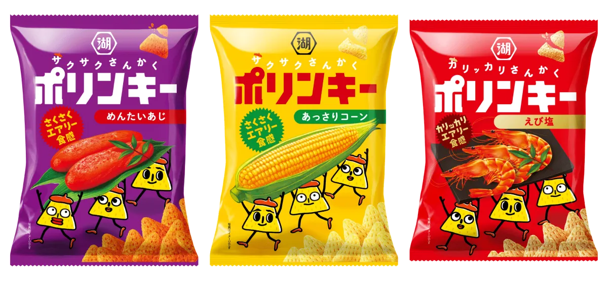 新たに登場する「ポリンキー あっさりコーン」は、その名の通りあっさりとした味わいが印象的。また「ポリンキー めんたいあじ」や「ポリンキー えび塩」も、既存の商品からさらなる進化を遂げており、特に新しい「えび塩」は、えびの風味と旨みを強化し、奥深い味わいになっています。テキスチャーも軽やかで、くちどけの良さが特徴です。