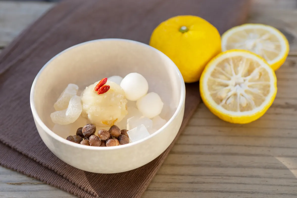 柚子には、風邪予防や美肌をサポートするビタミンCや、疲労回復に役立つクエン酸など、体に嬉しい栄養素が豊富に含まれています。これらの栄養を取り入れた「柚子白玉あんみつ」は、幅広い世代から人気を得ており、見た目も香りも楽しめる優雅なスイーツです。リラックスしたいひとときに、心と身体に優しいケアを提供してくれます。