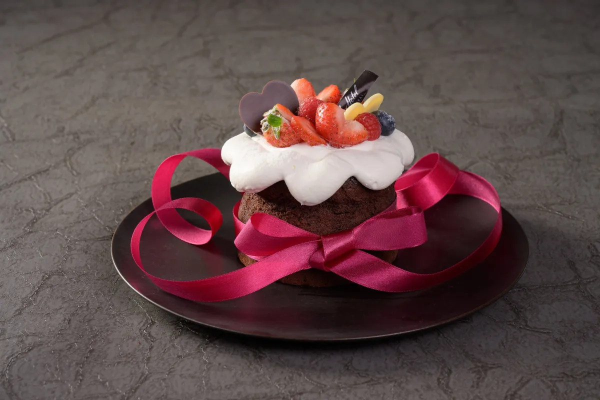 ガトーの表面には、ふんわり泡立てた生クリームが贅沢に盛られ、愛らしいハート型のチョコレートが添えられています。これらはまるで目の前に花が咲いたような、美しいデコレーションを施しています。さらに、華やかなリボンが巻き付けられており、このケーキの特別感がさらに際立ちます。