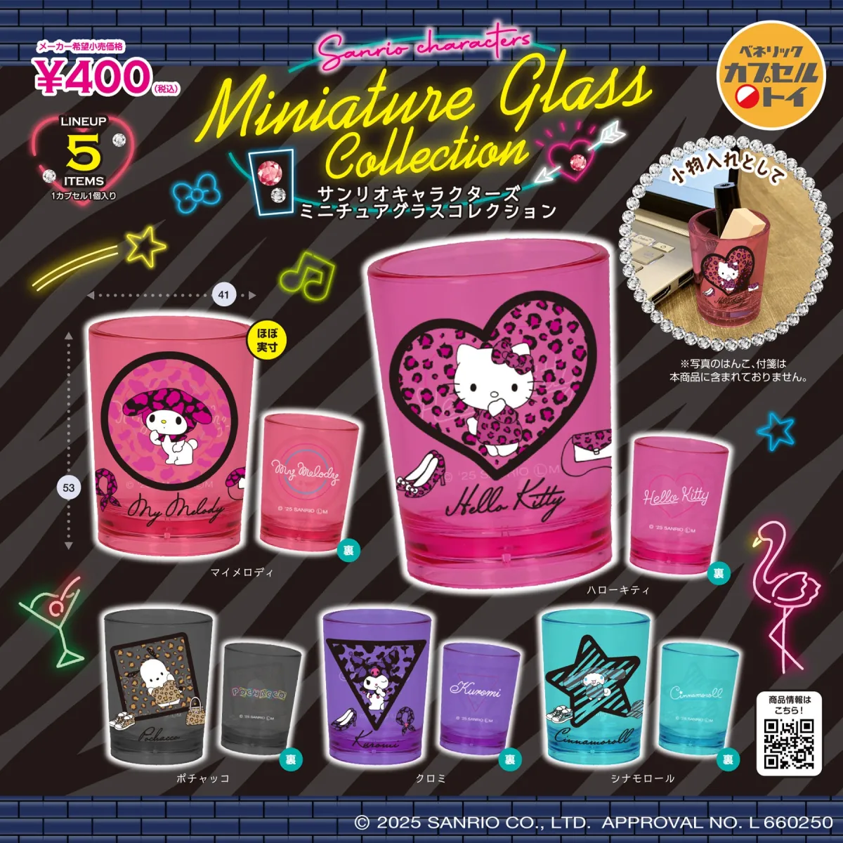このコレクションは、全5種類が揃ったミニチュアグラス。ビビッドなピンクやパープルのボディカラーに、レオパードやゼブラ柄のデザインが施されています。懐かしい雰囲気を醸し出しながらも、サンリオキャラクターたちの個性を活かしたファッション小物が飾られており、どこに置いてもお洒落感が漂います。