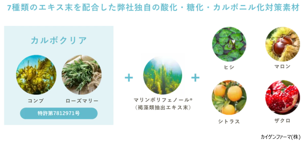 取得した特許(特許番号:第7812971号)では、昆布の抽出物とローズマリーの抽出物を使用し、優れたカルボニル化抑制に寄与する組成物として発表されています。これは、抗カルボニル化作用に関連した製品開発への道を開くものです。