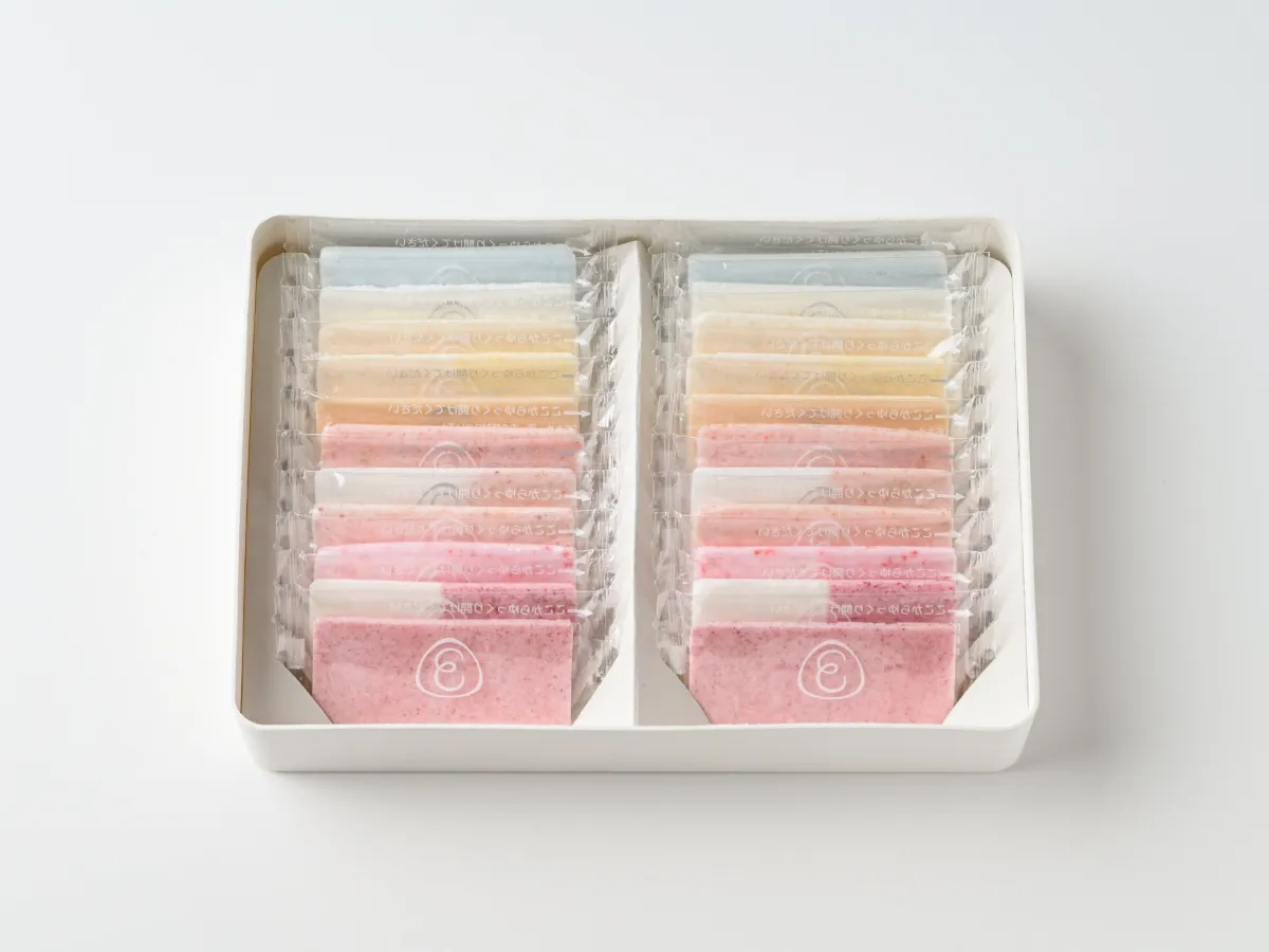 新商品の「板あめ羽一衣いろは」には、全11種類のフレーバーが含まれています。一つひとつのフレーバーは、ストロベリーやヨーグルト、キャラメル、ソーダ、宇和島ブラッドオレンジ、キャンベルアーリー、桃白鳳、あまおう、ラズベリー×王林シードル、マンゴー×大長レモン、あまおう×ヨーグルトというバラエティ豊かなラインナップです。それぞれのフレーバーの違いや、軽やかにほどける「パリッ」「サクッ」とした食感を存分に楽しんでください。