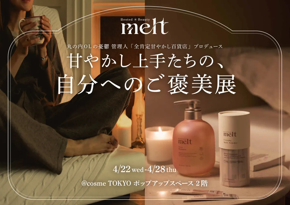 花王のヘアケアブランド「melt」が、人気美容インフルエンサーである「丸の内OLの憂鬱さん」と協力し、2026年4月22日から28日までの期間、@cosme TOKYOポップアップスペースにて「甘やかし上手たちの、自分へのご褒美展」を開催します。この特別な展覧会は、日々忙しく働く女性たちに向けた、リラックス時間の提案を目的としています。