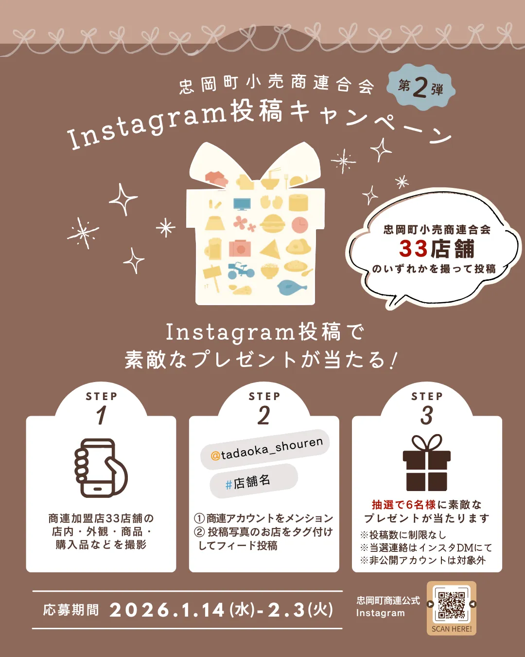 このキャンペーンは2026年1月14日(水)から2月3日(火)までの期間に開催され、参加方法はとてもシンプル。まずは、忠岡町にある33店舗の中から好きなお店で写真を撮影します。その後、撮った写真を自身のInstagramフィードに投稿します。この際には、忠岡町小売商連合会の公式アカウントをメンションし、撮影した店舗のアカウントや店舗名をタグ付けすることが必要です。