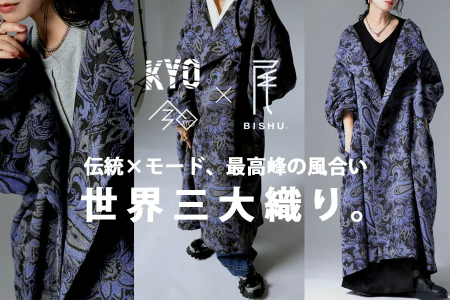 この尾州織を使用したコートは、ウール100%で構成されたロングコート。高密度のジャガード織で描かれたオリジナルのペイズリー柄が、洗練された雰囲気を放っています。また、驚くほど軽やかでふんわりとした風合いを持つこのコートは、秋冬の羽織りとしてロングシーズン活躍するでしょう。カラーバリエーションは、ユニセックスで着用可能なブルーミックスを用意しています。