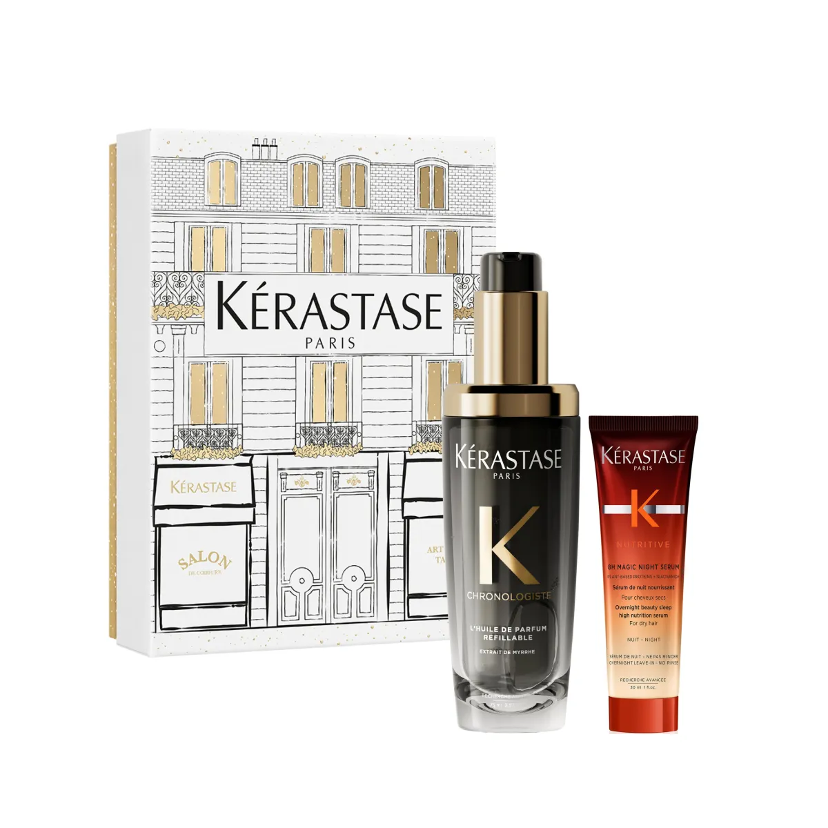 ケラスターゼの「ホリデーコフレ」には、同ブランドの人気製品が贅沢に詰め込まれています。特に注目なのが、最高峰のヘアオイル「ユイル クロノロジスト」と夜間用のヘア美容液「マジック ナイト セラム」。