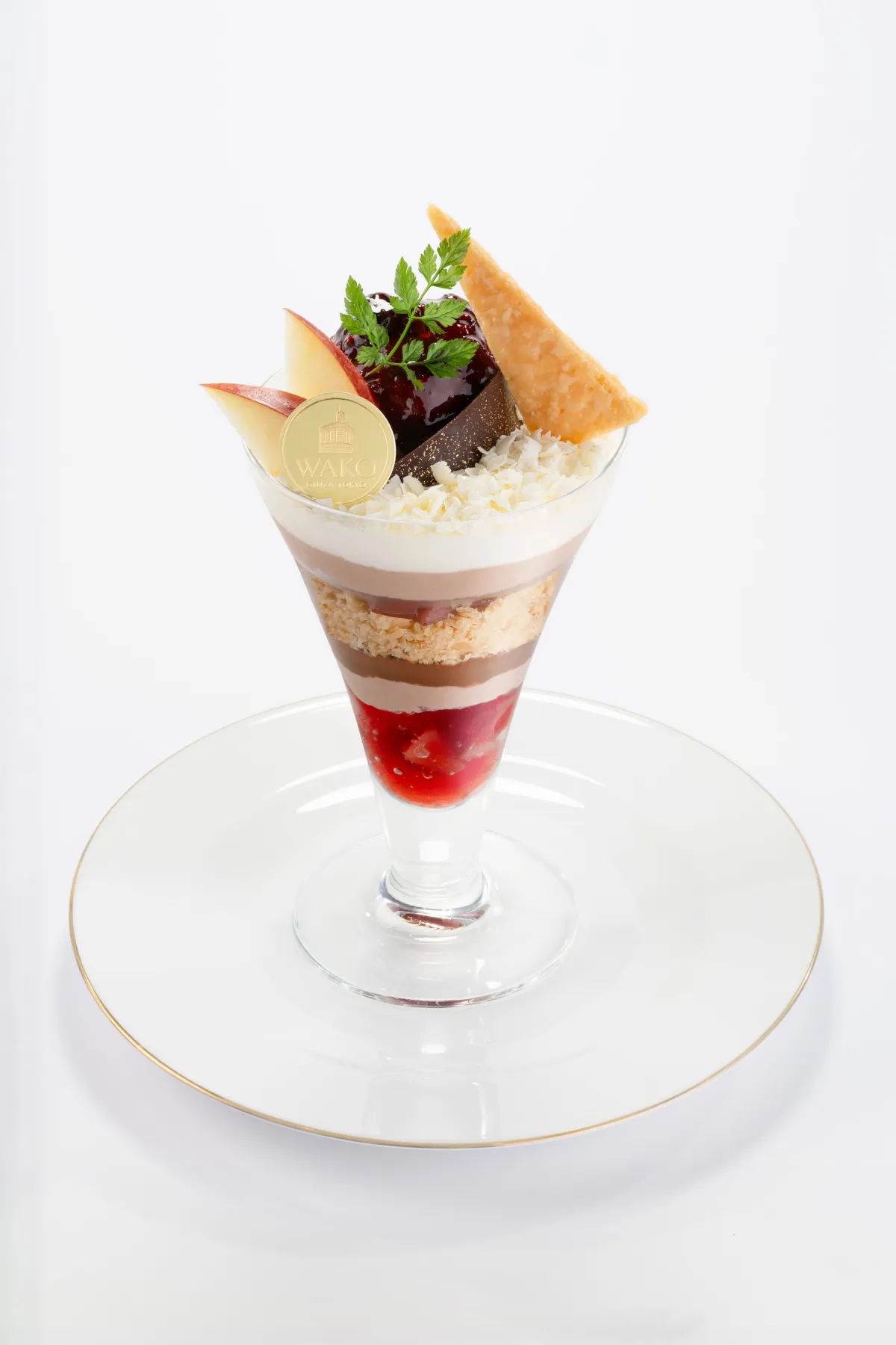 パフェのトップには、フレッシュな紅玉リンゴとスパイシーなベリーソースが飾られ、チョコレートアイスクリームの濃厚さを引き立てます。軽やかなホワイトチョコレートや生クリームが巧みに重なり、苦味のビターチョコレートクリームとリンゴのコンポートが絶妙なバランスで味わいを完成させています。さらに中層にはサクサクのホワイトチョコレートクランチやパイ生地が加わり、食感の変化も楽しむことができます。