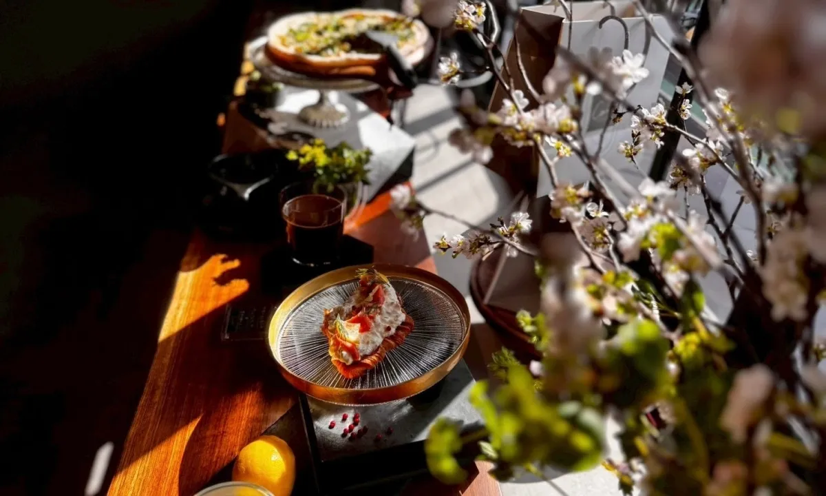 店内は桜のディスプレイに飾られ、春の食材を使ったメニューが並び、トップバリスタによるコーヒーとのペアリングも用意されていました。