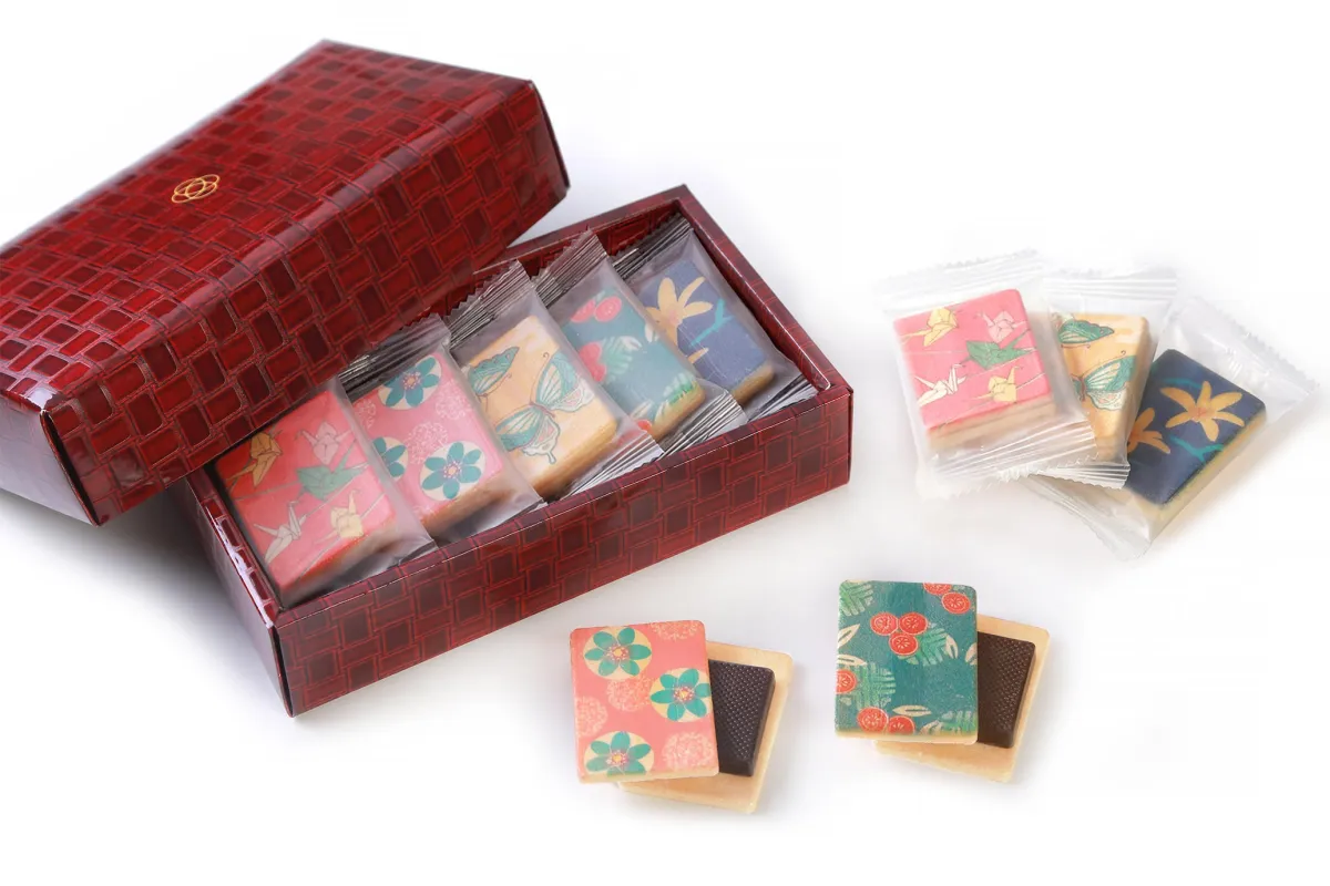 この商品には、草花や生き物を描いた香ばしい最中種に、まろやかなミルクチョコレートやコク深いダークチョコレートを挟んで楽しむスタイルが取り入れられています。それぞれの最中種には、日本の文化を反映させた5つのオリジナル絵柄が施されており、贈る人の想いを伝えるメッセージも込められています。