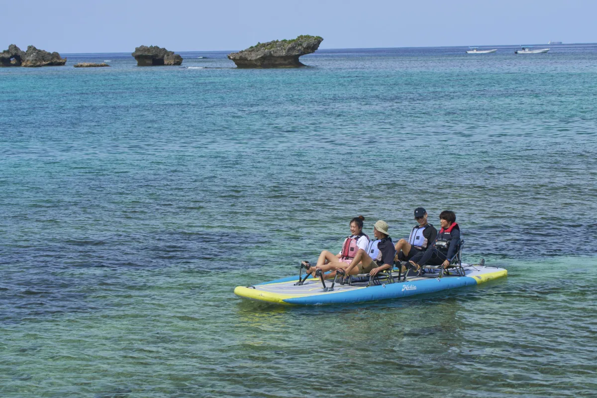 BIGペダルボート」。これは自分の力でペダルを漕ぎながら沖縄の美しい海を楽しむボートです。水着を着る必要もなく、冬でも快適に体験できるため、寒さを心配せずに海を満喫できるのがポイントです。このユニークな体験は、冬の沖縄ならではのアクティビティと言えます。